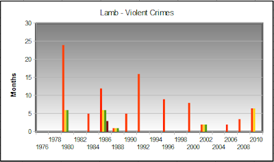 I think a visual representation might help. In the following graph I show the jail-term implications, as best as I could determine based on the data on James' blog, of violent crimes for which Lamb was convicted. My somewhat arbitrary grouping includes assaults, weapons offences, uttering threats and break & enter with violence.